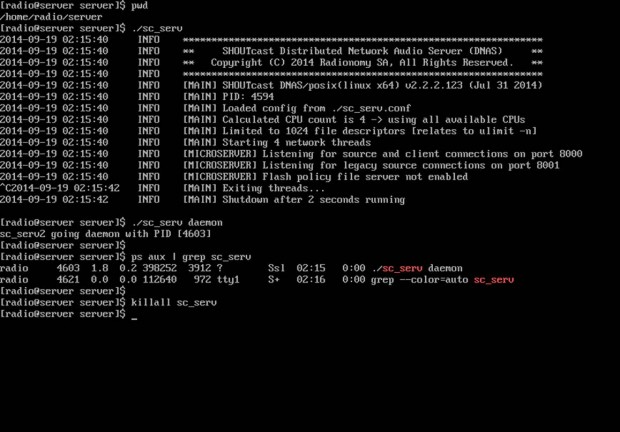 If you need a simplified command to start or stop SHOUTcast radio server, login as root again and create the following executable script on /usr/local/bin/ path as in the example below.