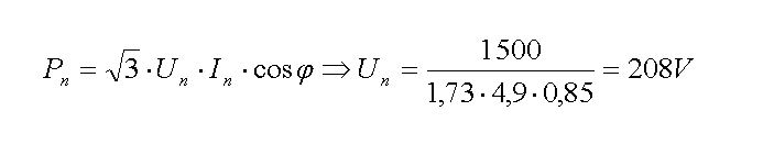 2.  Un electromotor trifazat cu puterea nominală Pn = 1500 W absoarbe un curent In = 4,9 A la un factor de putere cos jn = 0,85. Să se determine tensiunea nominală Un (dintre faze) la care funcţionează electromotorul.