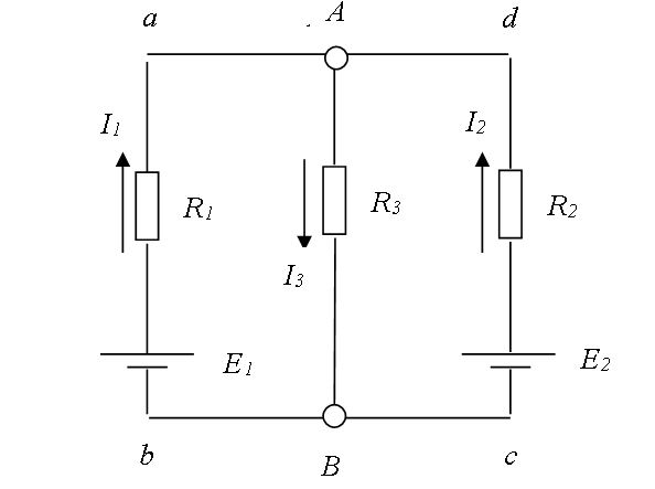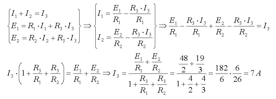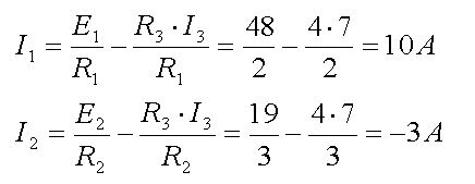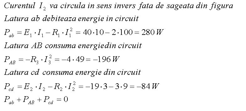 3. Să se determine curenţii în reţeaua din figură, cunoscând: E1 = 48 V, E2 = 19 V, R1 = 2 ohm, R2 = 3ohm, R3 = 4 ohm. Să se întocmească bilanţul energetic.