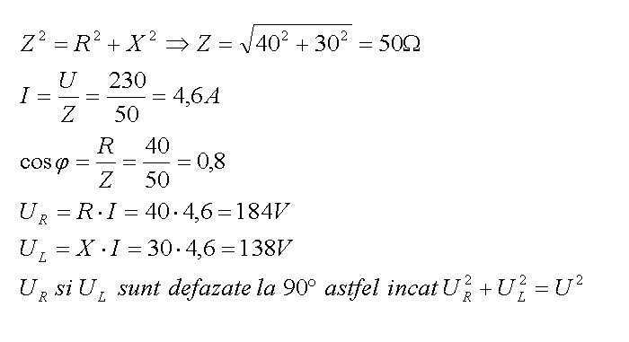 1. Într-un circuit cu tensiunea  U = 230 V în care sunt alimentate în serie o rezistenţă R = 40 Ω şi o bobină cu rezistenţă neglijabilă şi cu o reactanţă  X = 30  Ω se montează un ampermetru şi un cosfimetru. Să se determine indicaţiile aparatelor de măsură şi tensiunile la bornele rezistenţei, respectiv la bornele bobinei.
