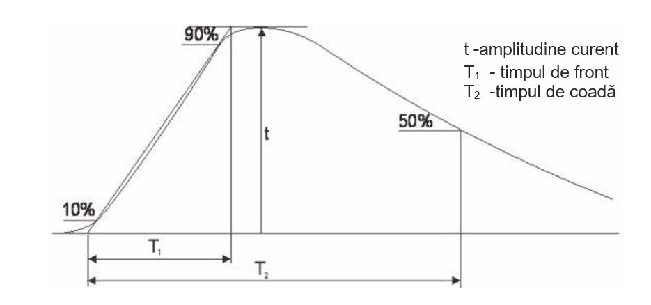 Impulsul 10μs/350μs corespunde primei secvențe a loviturii de trăznet, conform EN 62305,I7/2011. Forma impulsului de secven ă 8μs/20μs corespunde loviturii datorate efectelor câmpurilor magnetice inductive generate de curentul de trăznet care lovește în exteriorul SPT sau de o lovitură de trăznte în apropiere. Cu cât este mai scurt impulsul selectat pentru măsurare, cu atât este mai mare efectul de reactanţă.