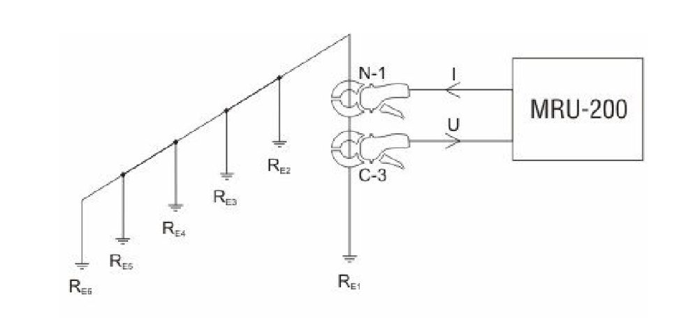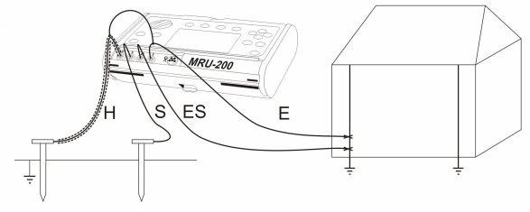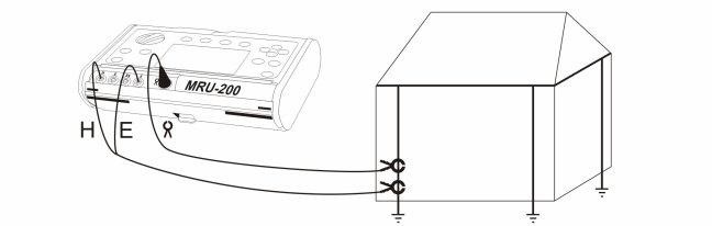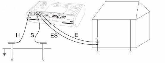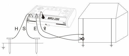 În practică, întreaga lungime a cablului de test trebuie utilizată (în cazul MRU-200, este 50m pentru electrodul de curent şi de 25m pentru electrodul de tensiune). Metoda de măsurare a rezistenţei de împământ cu metoda celor 3 țăruși (poli) este prezentată în figura de mai jos