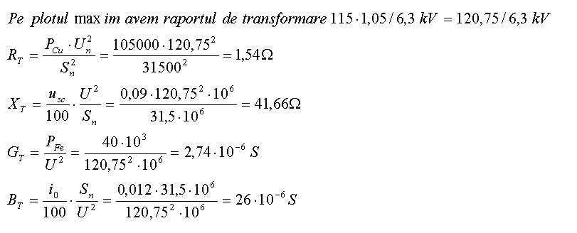 - a) Să se determine parametrii electrici ( RT, XT, GT şi BT ) ai unui transformator cu două înfăşurări de 31,5 MVA 115 2×2,5% / 6,3 kV, pierderile în cupru de 105 kW, pierderile în gol de 40 kW, usc[%]=9% şi i0[%]=1,2%. Parametrii electrici se vor raporta la tensiunea de pe plotul maxim al înfăşurării primare.