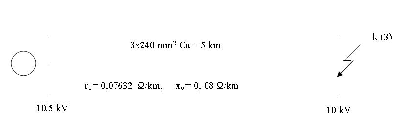 Lungimea, secţiunea conductoarelor de cupru, rezistenţa şi reactanţa specifice ale cablului sunt indicate în figură. Se consideră că scurtcircuitul este produs de o sursă de putere infinită şi se neglijează componenta aperiodică a curentului de scurtcircuit.