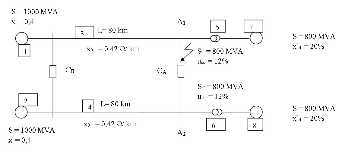 - Să se determine puterile de scurtcircuit la timpul t = 0 în cazul unui scurtcircuit trifazat pe barele A1 de 220 kV ale staţiei A în următoarele ipoteze: