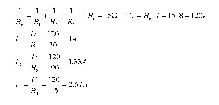 - Un circuit are trei derivaţii cu rezistenţele R1 = 30 Ω , R2 = 90 Ω , R3 = 45 Ω. Curentul în conductoarele de alimentare este I = 8 A. Să se determine tensiunea la bornele circuitului şi curentul din fiecare derivaţie.