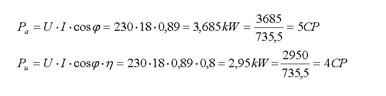 - Un electromotor monofazat având randamentul h = 80% şi cosj = 0,89 este parcurs de un curent I = 18 A la o tensiune de U = 230 V. Să se determine puterea absorbită din reţea şi puterea utilă ale electromotorului, în kW şi CP.