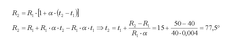 - La temperatura mediului ambiant t1 = 150 C, rezistenţa unui bobinaj al unei maşini electrice este r1 = 40 Ω. După o funcţionare mai îndelungată, rezistenţa bobinajului creşte la valoarea R2 = 50 Ω. Să se calculeze temperatura t2 la care a ajuns bobinajul după funcţionare, ştiind că bobinajul este făcut din cupru cu coeficient de temperatură α = 0,004 .