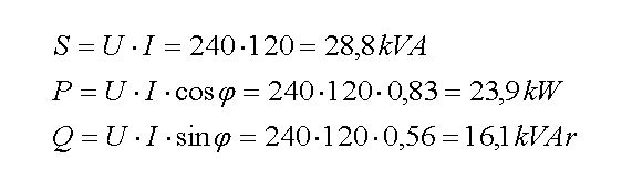 - Un generator de curent alternativ alimentează cu energie electrică un circuit care are cosj = 0,83. Tensiunea la bornele generatorului este U = 240 V iar curentul în circuit I = 120 A. Să se determine puterile generate: aparentă, activă şi reactivă.