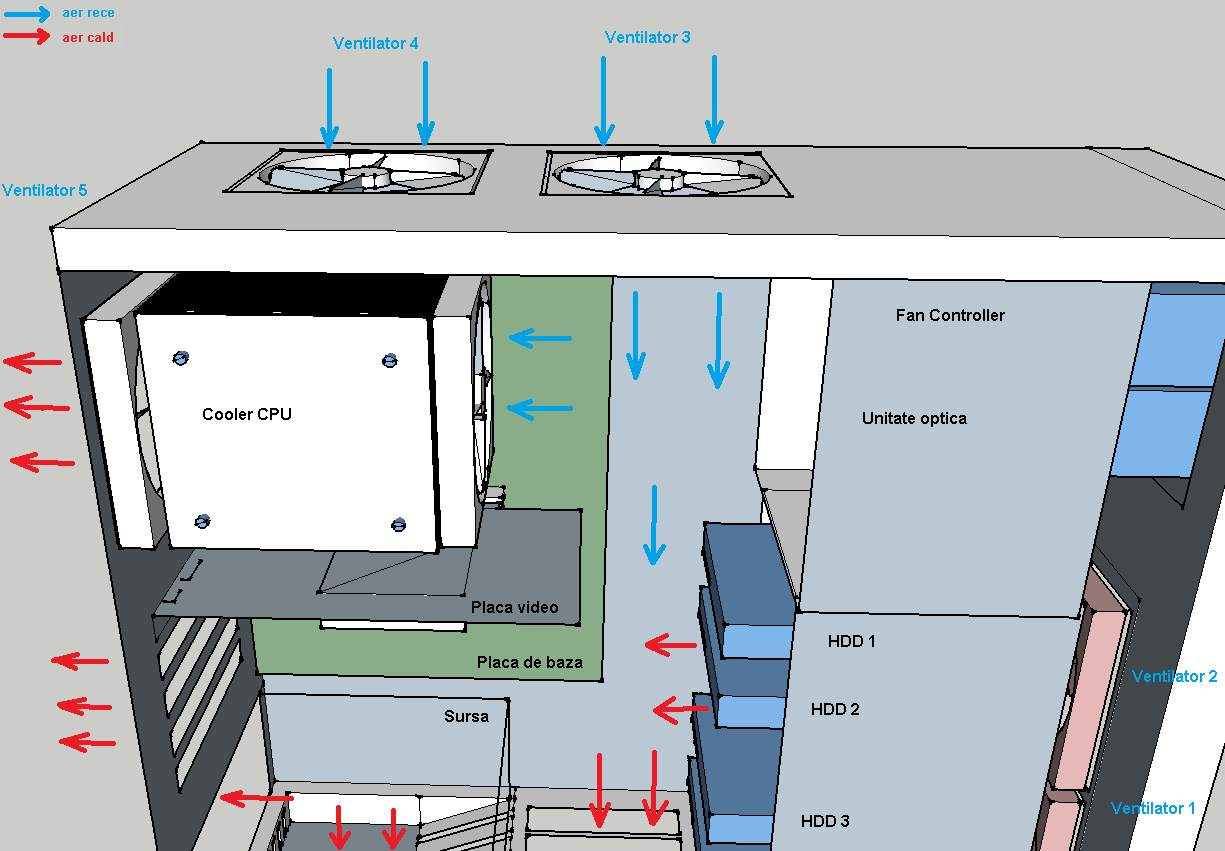 Pe langa cele 6 locuri pentru ventilatoare sunt necesare si spatii pentru aerisire care sa se afle in dreptul HDD-urilor si in dreptul placii de baza.