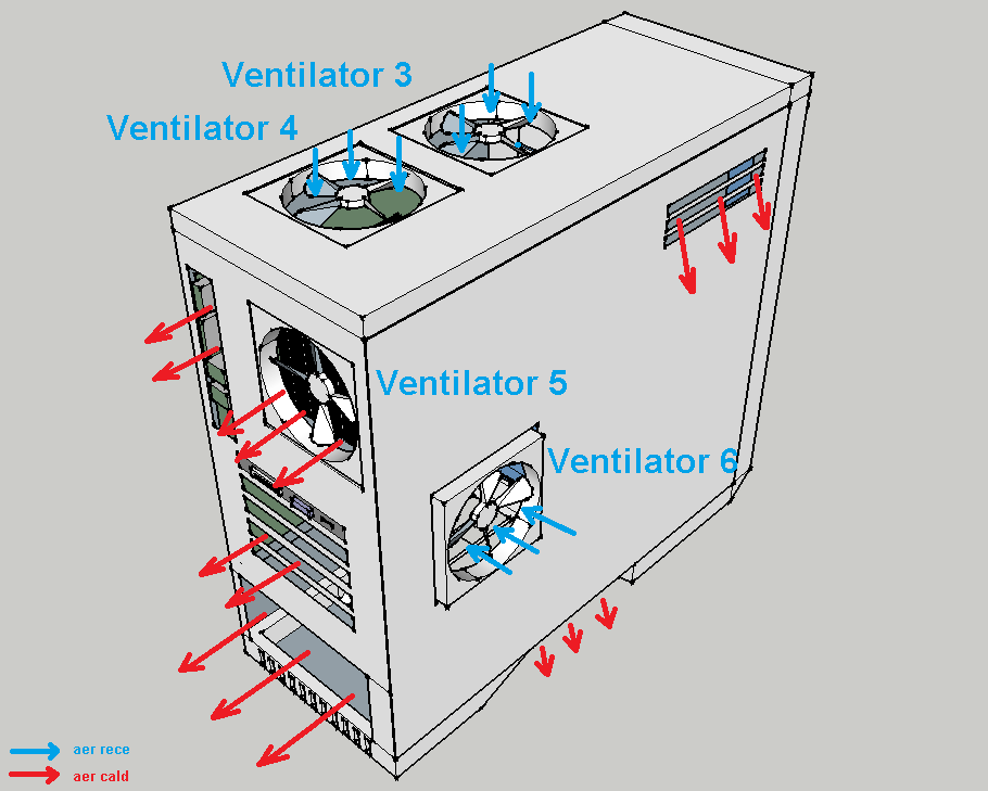 Ventilatorul 6 trebuie setat la 40-50%, si montat pe panoul lateral, in dreptul placii video si a celorlalte placi. Pe langa cele 6 ventilatoare se vor mai gasi inca 1 ventilator pe radiatorul procesorului, 1 ventilator la placa video, si posibil inca alte 2 la sursa.
