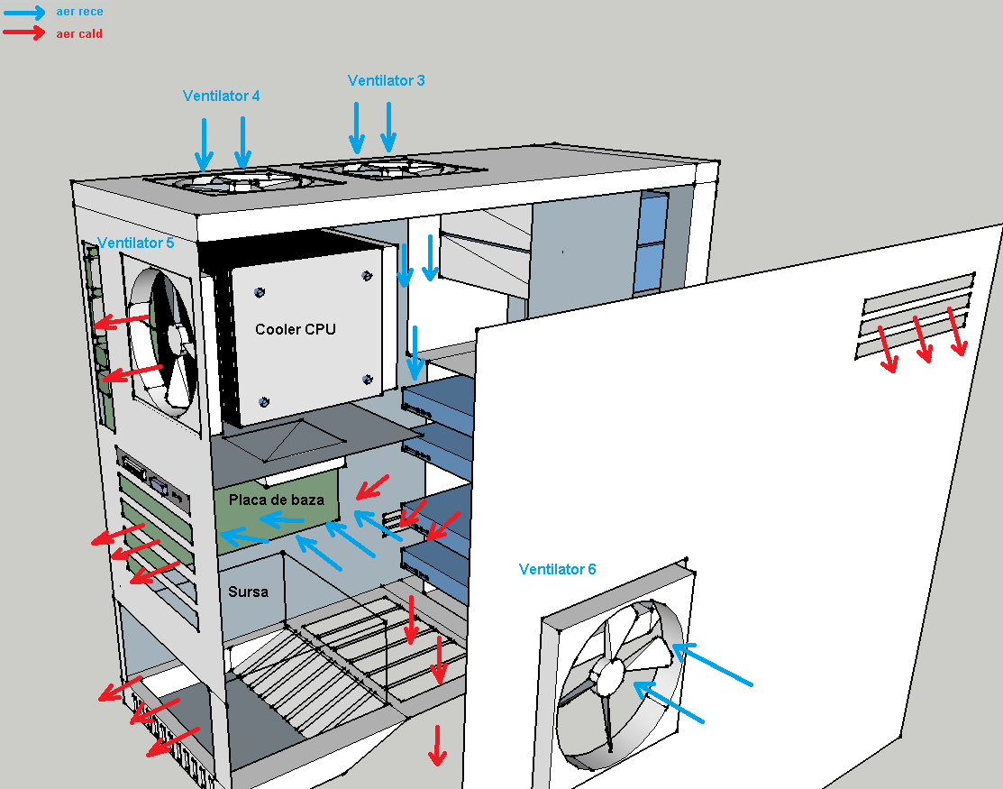 Avem nevoie de o carcasa ATX Middle Tower sau ATX Full Tower, care sa aiba locasul pentru sursa pozitionat in partea de jos, si o distanta de sol de min. 2cm. Deasemenea sa aiba locasuri pentru 6 ventilatoare care vor fi montate in felul urmator: